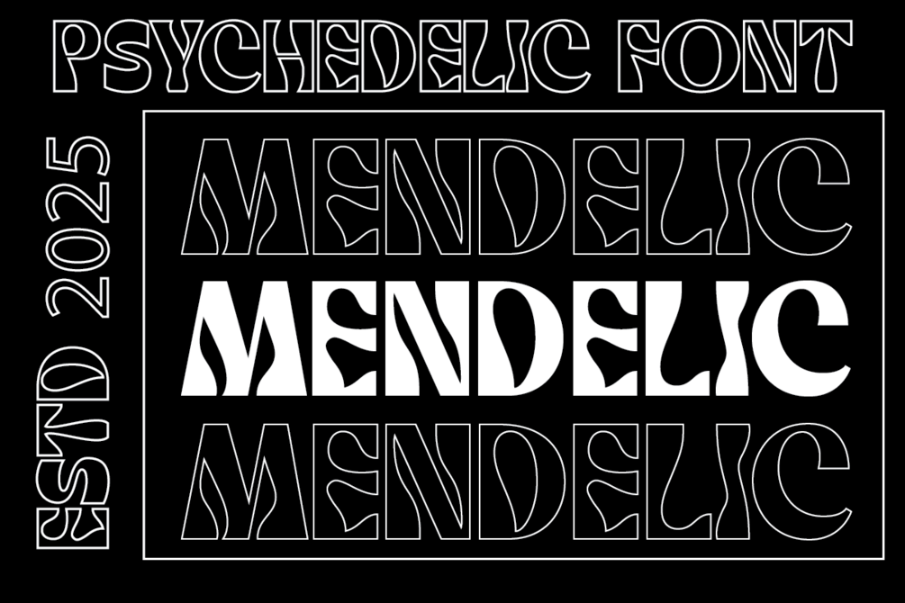 Mendelic Psychedelic font. This font would be perfect for photography, watermarks, social media posts, advertisements, logos & branding, invitations, product design, labels, stationery, product packaging, special events, and other projects.